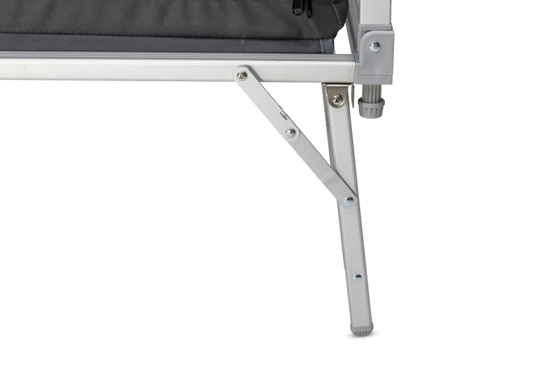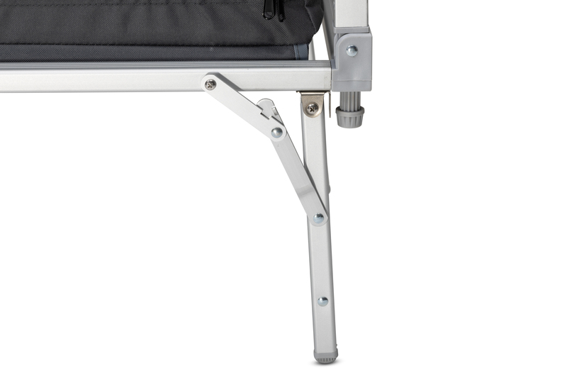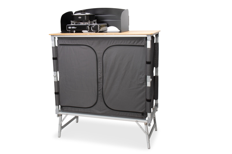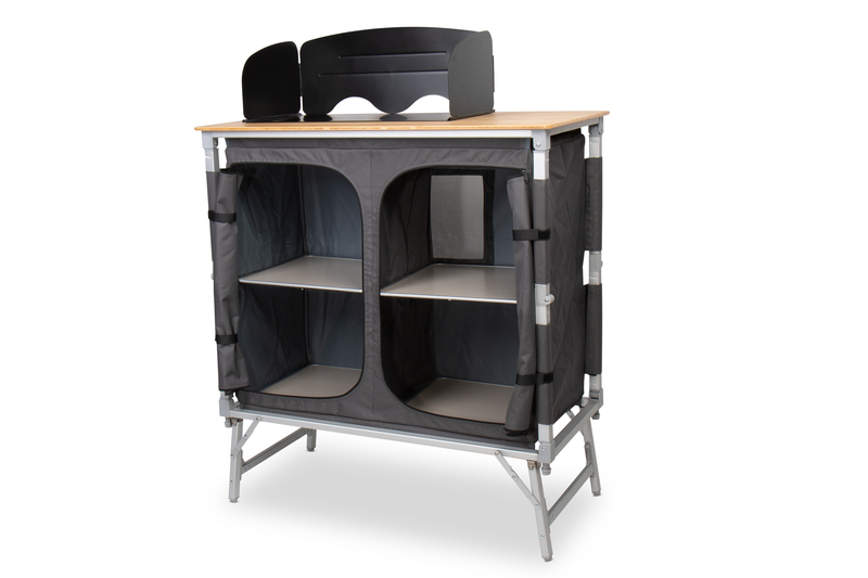 Kempingová kuchyňa je pripravená na použitie v priebehu niekoľkých sekúnd vďaka pohodlnému systému rýchlej montáže. Všetky kuchyne majú bambusovú pracovnú dosku, ľahký hliníkový rám, vložené police z pevných MDF dosiek a veterný štít.
