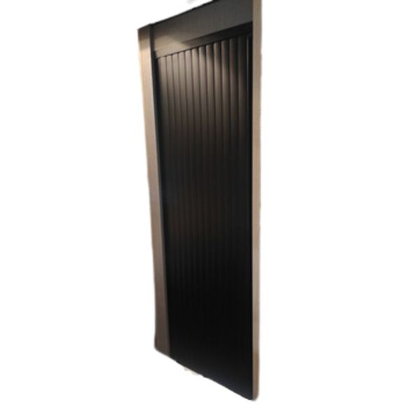 Rolovacie plastové dvere do kúpeľne alebo toalety s montážnymi koľajničkami. Dvere sú dostupné v striebornej alebo čiernej farbe s madlom na oboch koncoch.
