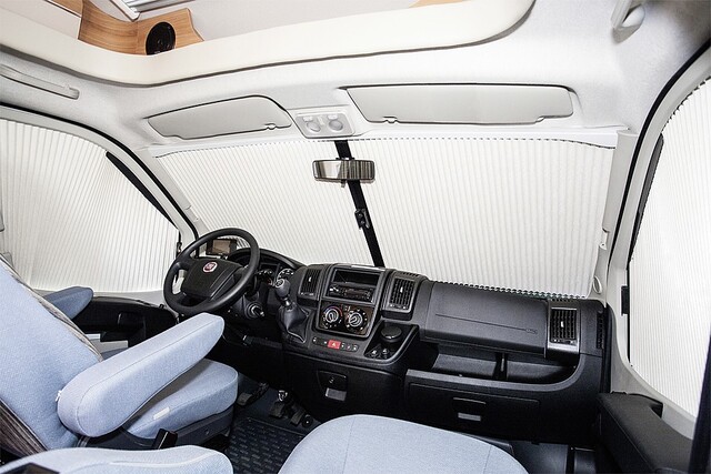 - Systém zatemnenia kabíny pozostávajúci z plisovaného skladacieho systému pre čelné sklo a dvoch zatemňovacích systémov pre bočné okná